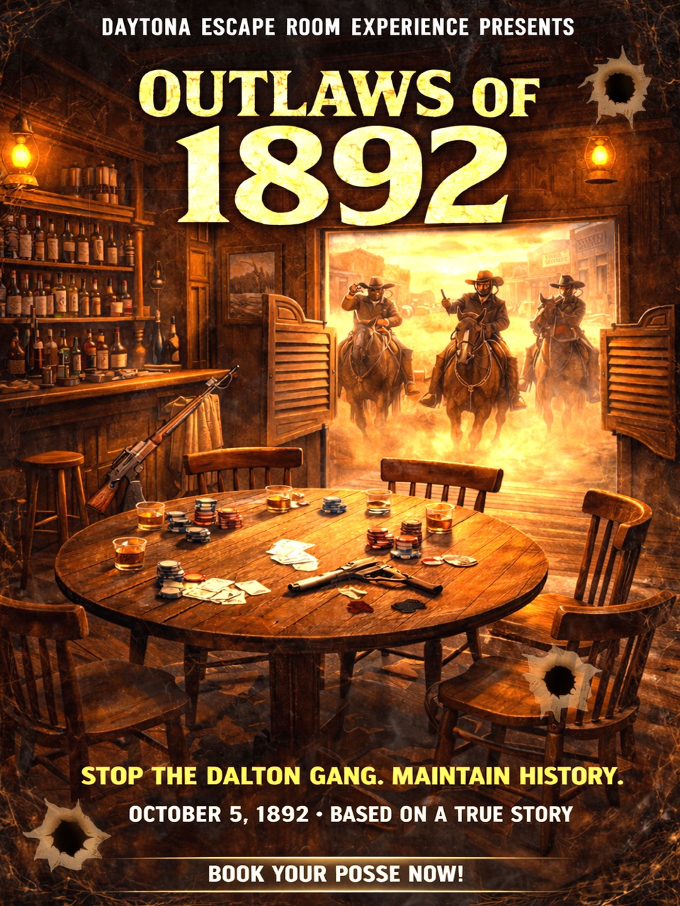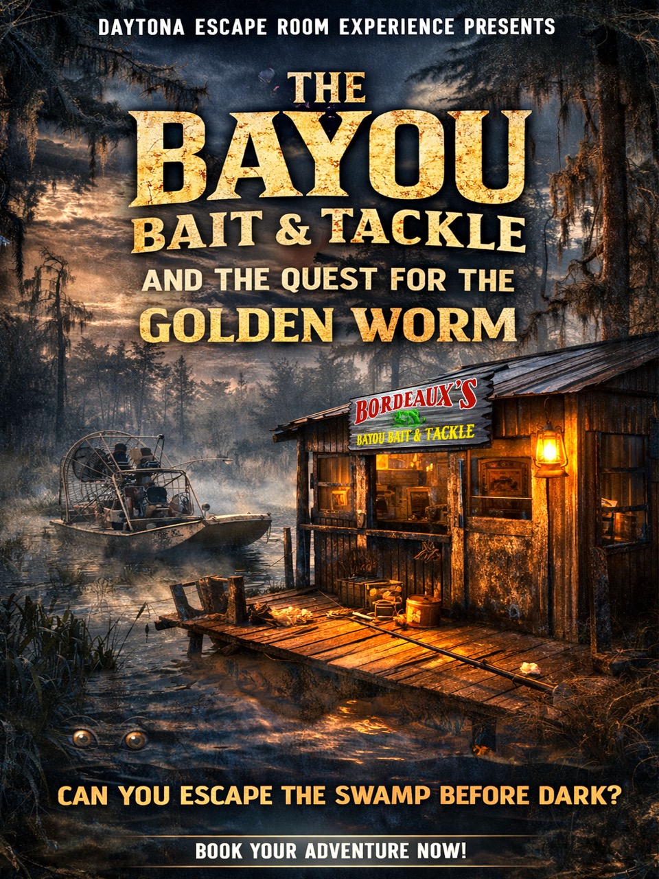 Y’all done crash landed in the heart of the swamp, and night’s creepin’ in. With critters stirrin’ and no cell service for miles, your only way out is Big Al Boudeaux’s prized airboat but he won’t hand over the keys ‘less you reel in the legendary Ol’ Slippery Jack. Rumor is, the only bait that’ll do the trick is the elusive Golden Worm, locked up somewhere inside his shuttered bait & tackle shop. Can your crew outsmart Big Al’s swampy tricks and earn your freedom or will the bayou claim another batch of city slickers?